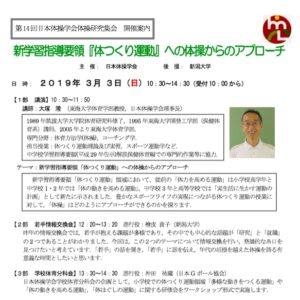 「第14回体操研究集会」終了しました 投稿日 2019年3月4日 著者 office カテゴリー Info 3月3日(日)に新潟で「第14回体操研究集会」を実施しました。 ご参加・関係者のみなさま、ありがとうございました。 実施内容 pickup